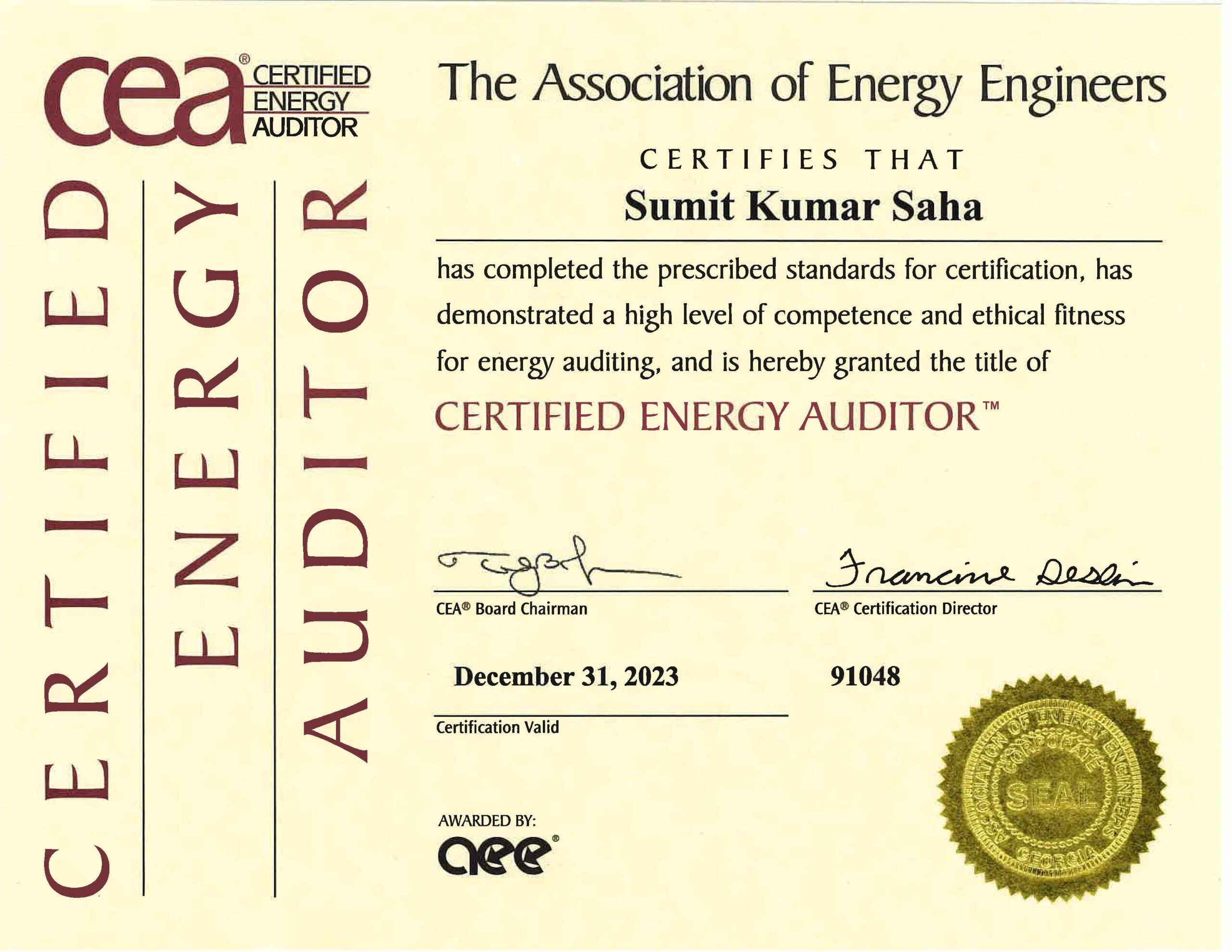 - Certified Energy Auditor (CEA), Reg No: 91048