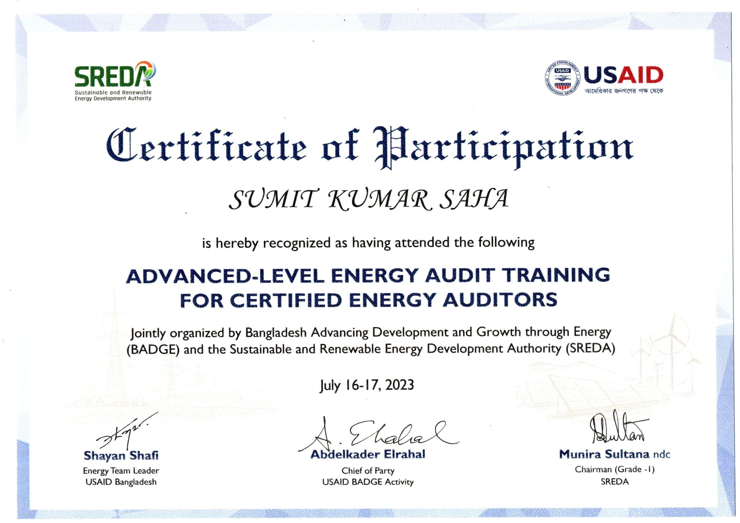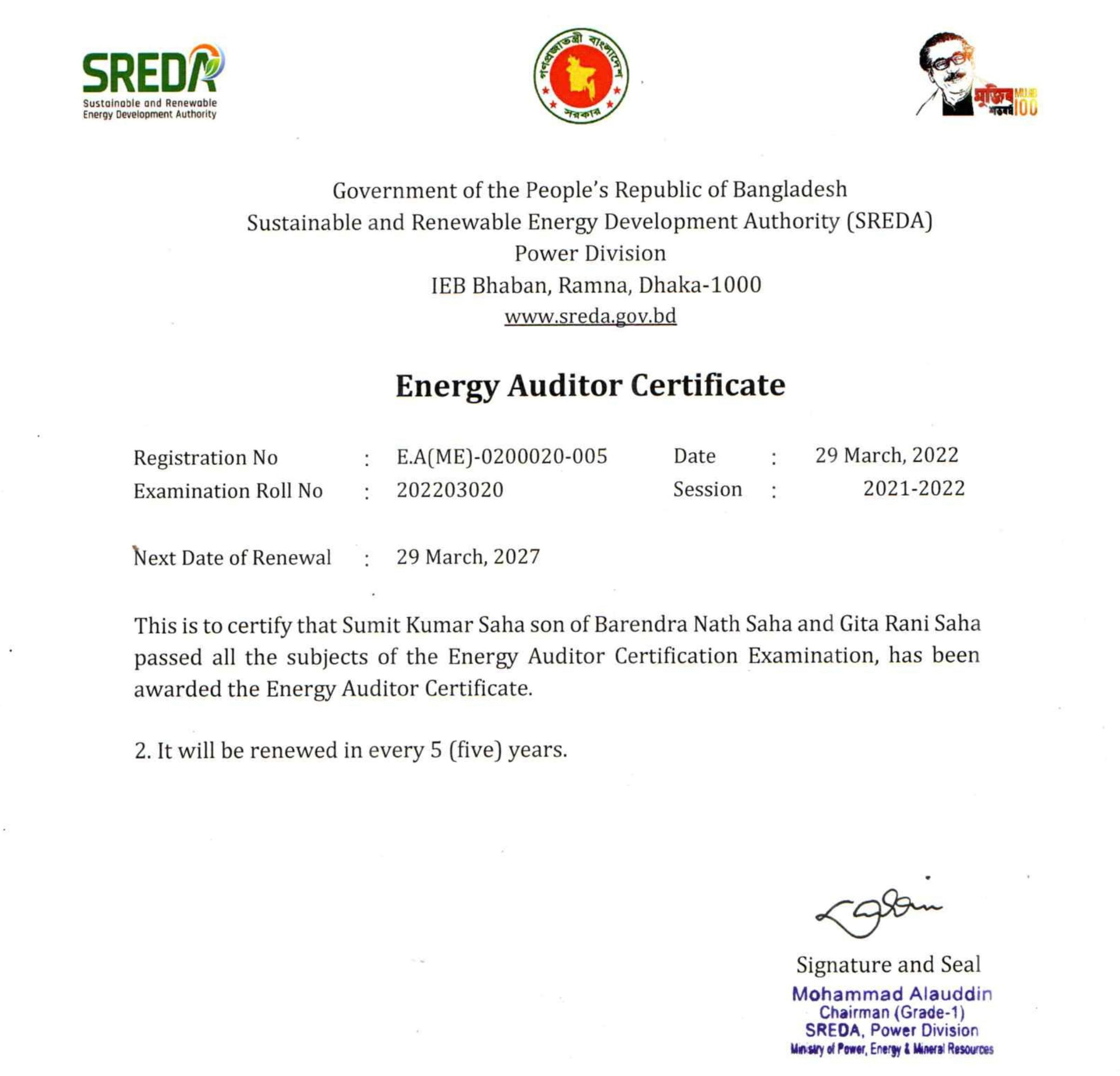 - Energy Auditor, SREDA, Bangladesh Govt.