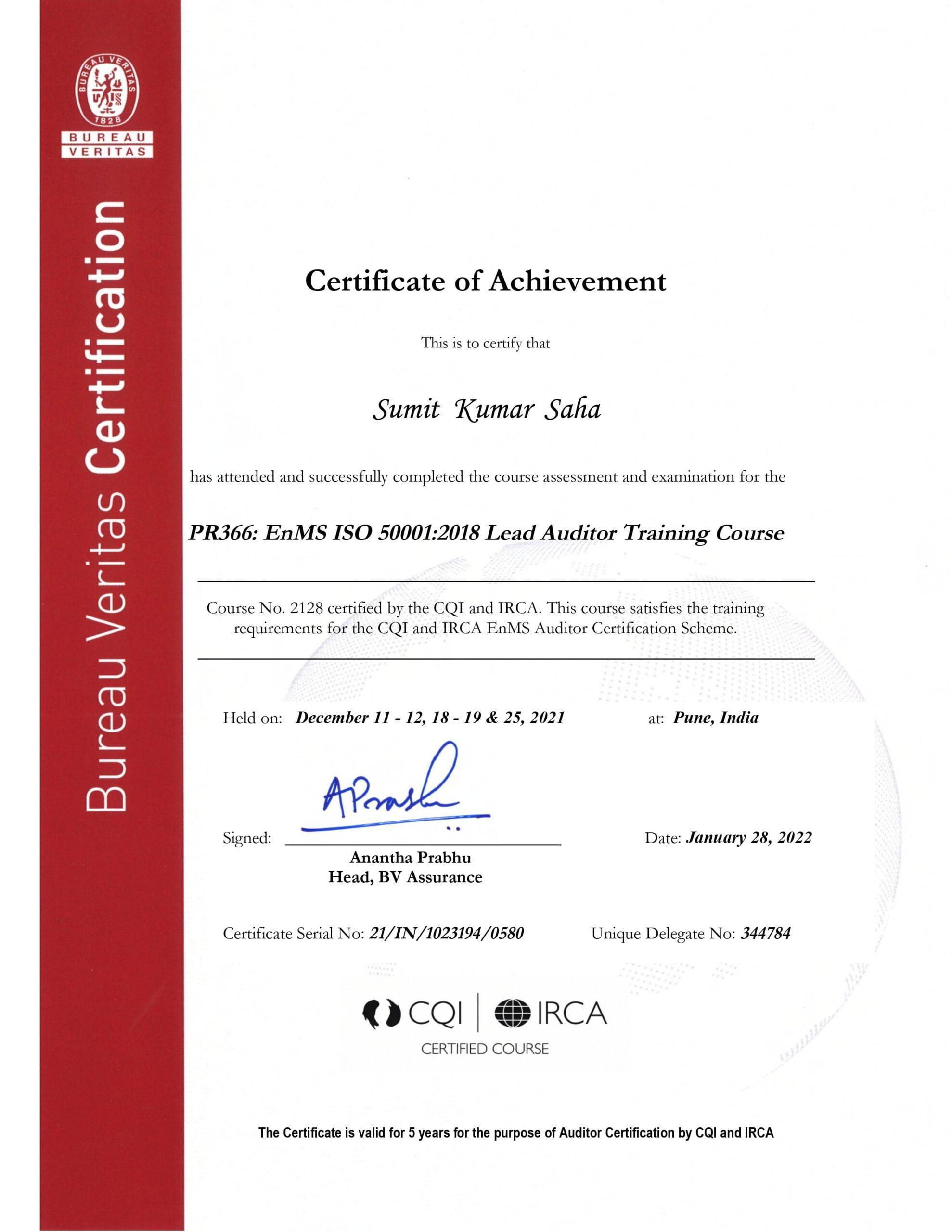 - Lead Auditor, EnMS ISO 50001:2018, Bureau Veritas, India – 2022