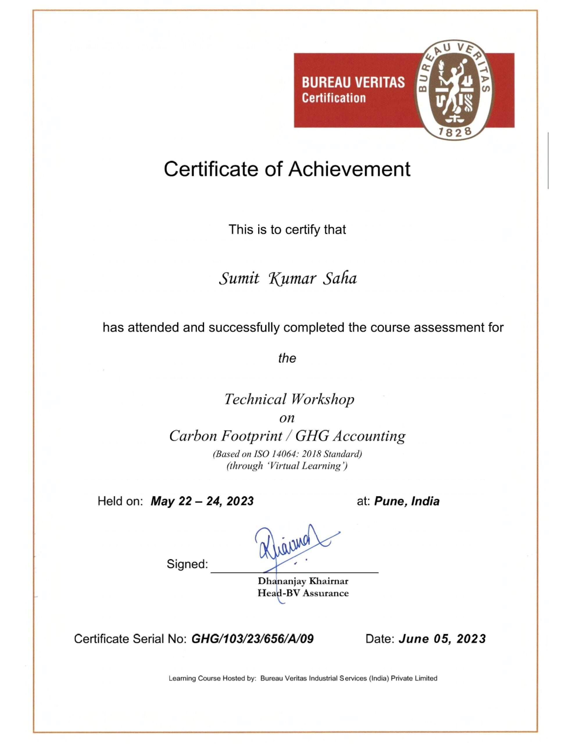 - Certified Carbon footprint / GHG accounting as per ISO 14064:2018